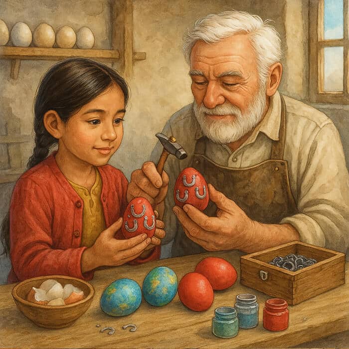 Früher arbeiteten viele Menschen im Dorf als Schmiede. Statt nur Pferde zu beschlagen, begannen einige von ihnen, zur Osterzeit auch kleine Metallhufeisen zu formen und sie mit winzigen Nägeln vorsichtig auf hartgekochte, bemalte Eier zu nageln. So entstanden echte kleine Kunstwerke – die Hufeisen-Eier.