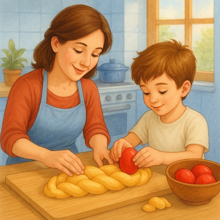„Ja“, lächelte Mama. „So wie in Griechenland. Süßes Osterbrot mit einem roten Ei in der Mitte. Dieses Jahr machen wir einen großen Zopf.“