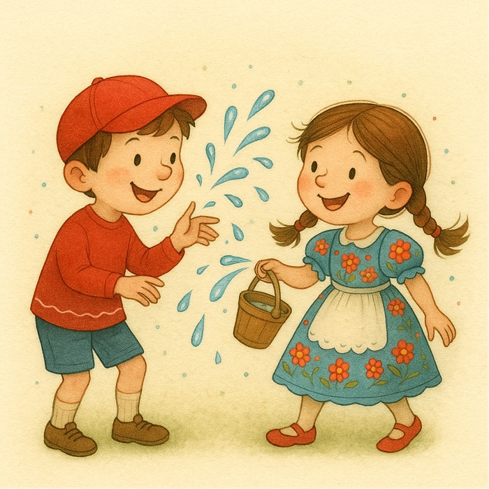Tante Ania läutete die Glocke. Ihr heller Ton hallte durch die Straße, und bald kamen weitere Kinder dazu. Sie standen im Kreis, gaben vorsichtige Spritzer weiter und riefen: „Für gute Noten!“, „Für Gesundheit!“, „Für viele freie Tage!“