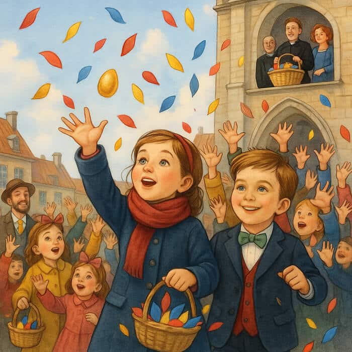 In manchen Orten in Belgien gibt es an Ostern einen besonderen Brauch: Vom Kirchturm werden viele bunte Papier-Eier auf den Platz geworfen – manchmal sogar ein „goldenes“ Ei als Hauptpreis. Die Kinder versuchen, die Eier in der Luft zu fangen oder schnell vom Boden aufzusammeln. Auf manchen Eiern stehen kleine Gewinne (z. B. Süßigkeiten oder Getränke). Der Eierregen ist wie ein fröhliches Spiel nach der Ostermesse und gehört für viele Familien fest zum Osterfest dazu.