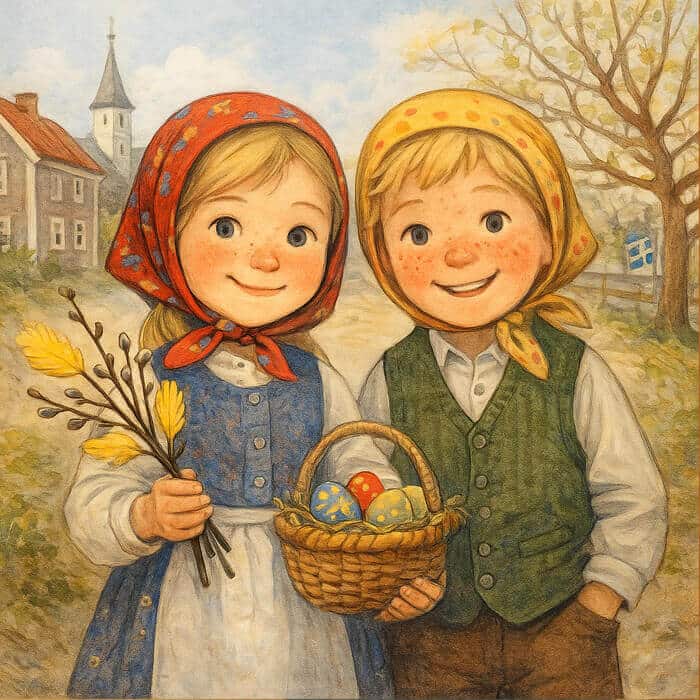 In Schweden verkleiden sich Kinder zu Ostern oft als Osterhexen („Påskkärringar“): mit Kopftuch, Schürze, bemalten Wangen und selbst gestalteten Karten gehen sie von Tür zu Tür, wünschen „Glad Påsk“ („Frohe Ostern“) und bekommen Süßigkeiten. Viele Familien schmücken außerdem ein Påskris – Birkenzweige, die in einer Vase stehen und mit bunten Federn, Bändern oder Eiern dekoriert werden. So holen sie symbolisch den Frühling ins Haus und machen es farbenfroh, lange bevor die Bäume draußen richtig grün sind.