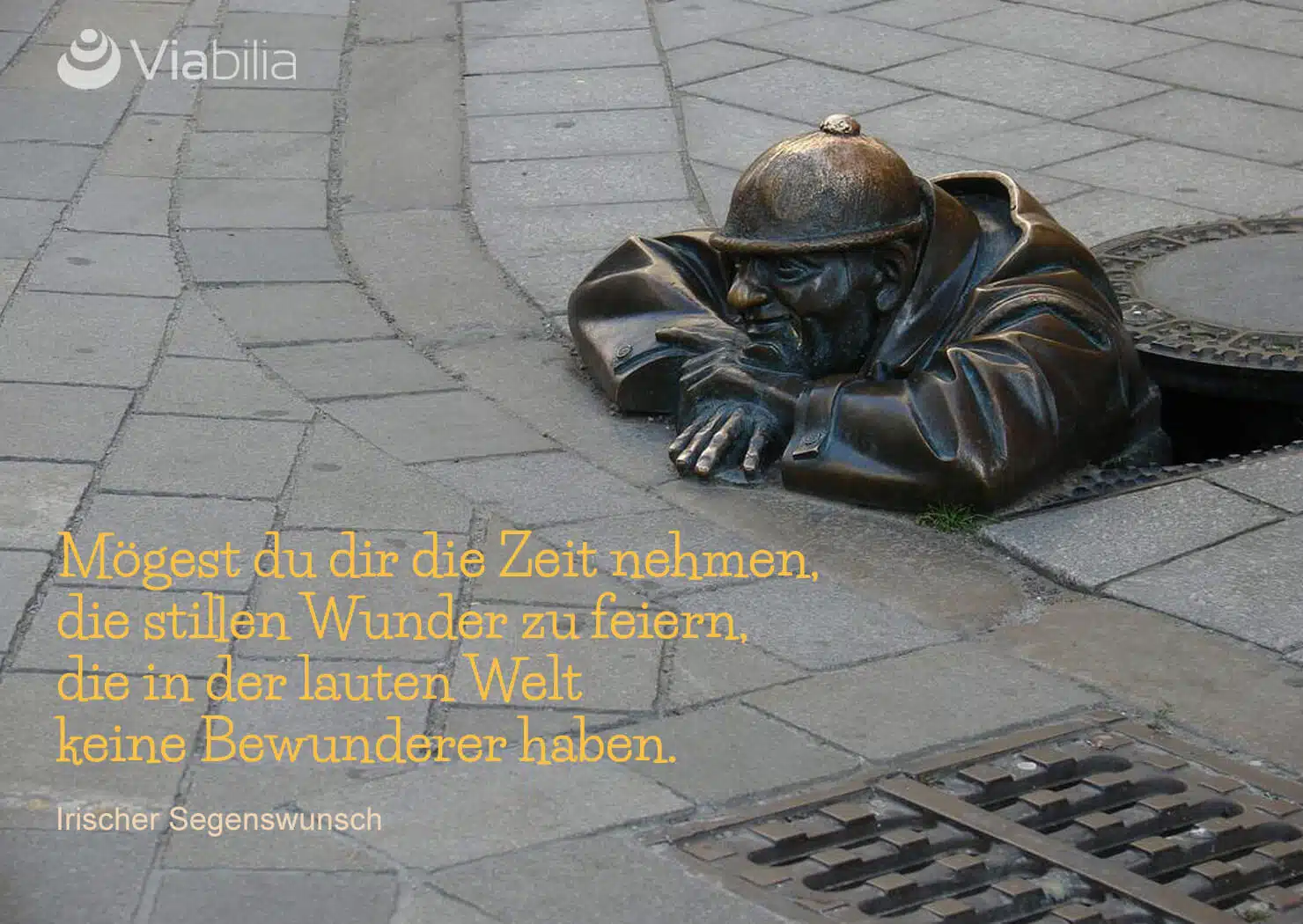 Echte Wunder nicht immer in der Hektik und dem Lärm der Welt zu finden, sondern sie liegen oft in den stillen, übersehenen Details unseres Alltags verborgen. Dieser irische Segenswunsch mit dem humorvollen Bild ist ein Aufruf, bewusster zu leben und die Zeit zu finden, diese unscheinbaren Alltagswunder zu erkennen und zu würdigen, die unser Leben auf subtile und schöne Weise bereichern.